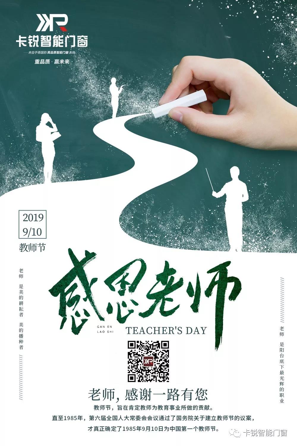 9月10日是一年一度的教師節(jié),師也者,教之以事而喻諸德者也。桃李滿天下,或許是老師最值得驕傲的事情。習(xí)其道、學(xué)其言、效其行,老師對我們的影響足以雕刻靈魂。學(xué)生終將離開學(xué)校,但老師種下的那顆“種子”卻始終在學(xué)生們的心靈深處綻放,盛開出最絢爛的花朵。在此,卡銳智能門窗祝福所有的老師:“節(jié)日快樂,您們辛苦了”!